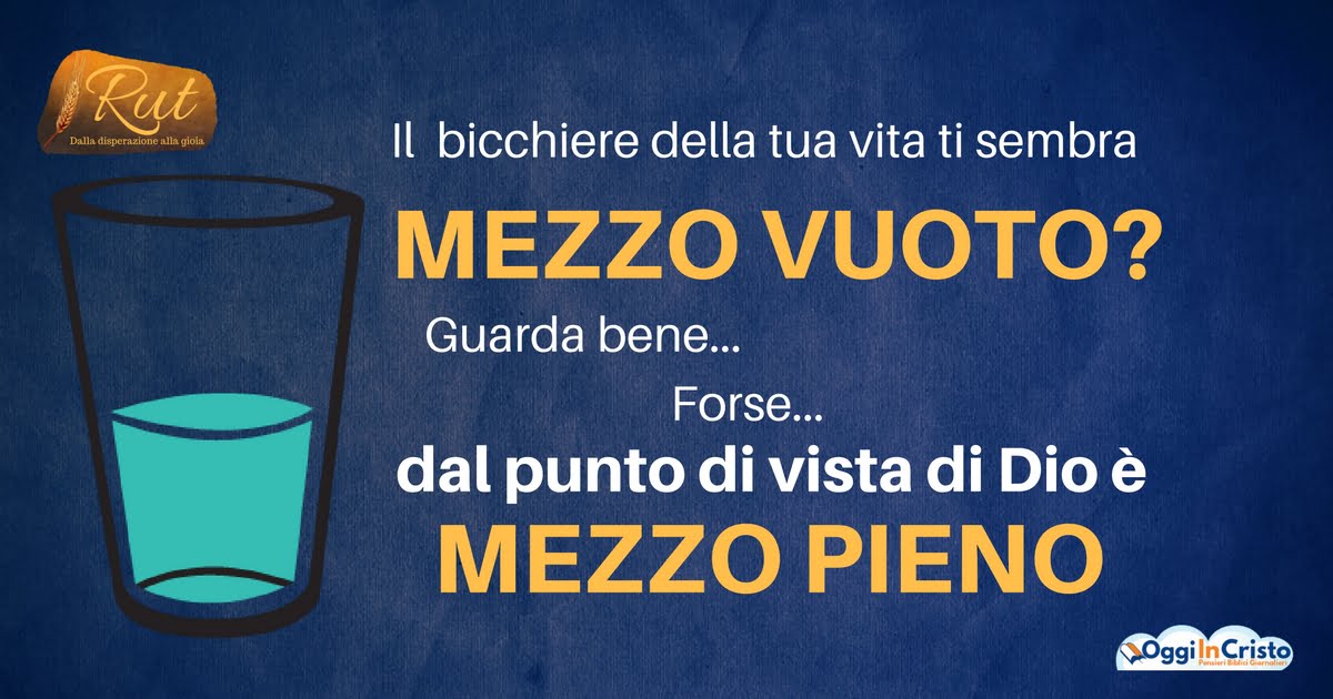 Talvolta, come Naomi, vediamo il bicchiere quasi vuoto e non nutriamo alcuna speranza per il nostro futuro. Talvolta potrebbe sembrarci che Dio stia stendendo la sua mano contro di noi. Se guardassimo quel bicchiere dal punto di vista di Dio, potremmo accorgerci che egli non è nostro nemico ma ha già cominciato a riempire di nuovo quel bicchiere. Può sembrare pazzesco, ma dal punto di vista di Dio, come stava accadendo per Naomi, quel bicchiere potrebbe essere già mezzo pieno.
