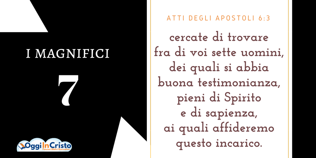 Così la comunità presentò agli apostoli sette uomini dei quali si aveva buona testimonianza, pieni di Spirito e di sapienza: Stefano, Filippo, Procoro, Nicanore, Timone, Parmena e Nicola, proselito di Antiochia. Questi furono i magnifici sette scelti per assistere gli apostoli nella gestione del denaro per l’assistenza ai bisognosi. Gli apostoli, pregando e imponendo le mani su di loro, accolsero quegli uomini e affidarono loro l’incarico che avevano stabilito.