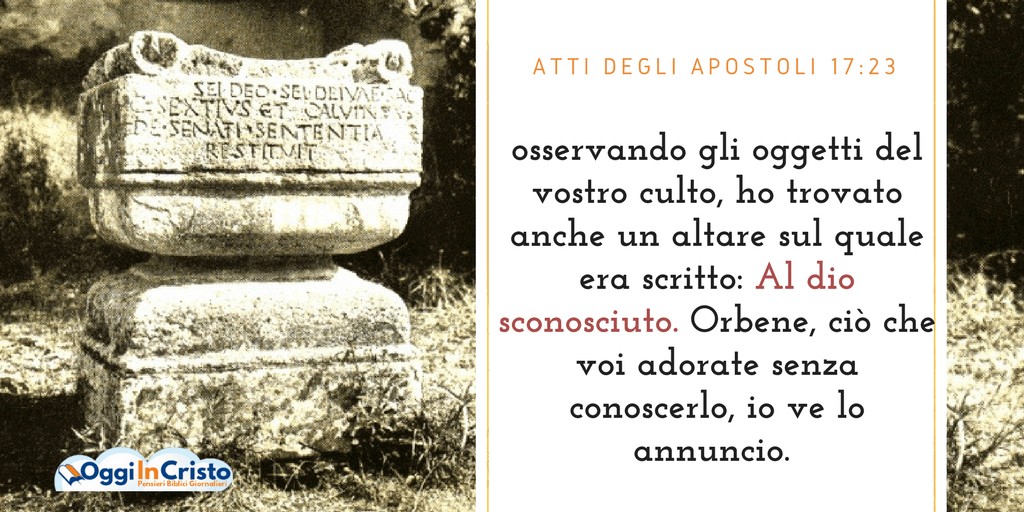 «Ateniesi, vedo che sotto ogni aspetto siete estremamente religiosi. Poiché, passando, e osservando gli oggetti del vostro culto, ho trovato anche un altare sul quale era scritto: Al dio sconosciuto. Orbene, ciò che voi adorate senza conoscerlo, io ve lo annuncio.