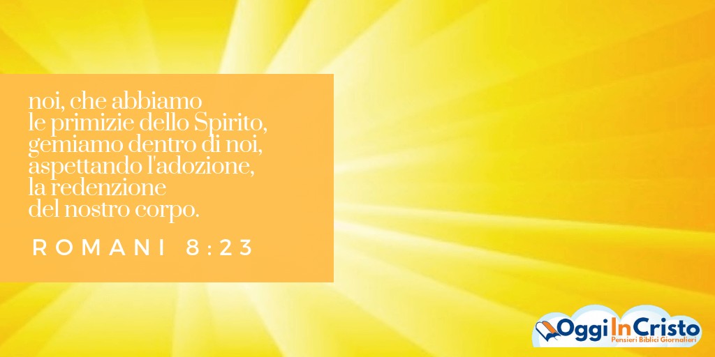 coloro che hanno “le primizie dello Spirito” partecipano al travaglio della creazione. Cosa significa questa strana espressione? Così come in un raccolto ci sono le primizie e poi viene il resto del raccolto, così l’apostolo Paolo indica i credenti come coloro che sono i primi frutti della nuova creazione di Dio che entrerà nella sua pienezza solo alla fine dei tempi (si legga Apocalisse 21-22). Avendo le primizie dello Spirito, i credenti aspettano insieme alla creazione proprio la manifestazione finale del regno di Dio e guardano con fiducia alla redenzione completa del proprio corpo attraverso la risurrezione e alla realizzazione finale di tutte le promesse di Dio. D’altra parte ora siamo già figli di Dio ma il nostro corpo è soggetto a decadimento e morte, ma quel giorno riceveremo un corpo nuovo che non sarà più soggetto a corruzione, a decadimento, a morte. Se ora abbiamo le primizie dello Spirito, in quel giorno ci godremo davvero tutta la pienezza delle cose buone che Dio ha preparato per noi per l’eternità.