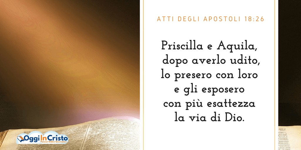 C’è quindi una bella lezione anche per noi in questo brano. Che il Signore ci guidi nel saper apprezzare gli eventuali Apollo sulla nostra strada e ci dia di utilizzarci per la loro istruzione, non per la loro distruzione, non per spegnere il loro entusiasmo con il nostro giudizio ma per farli crescere e migliorare nello zelo e nella conoscenza.