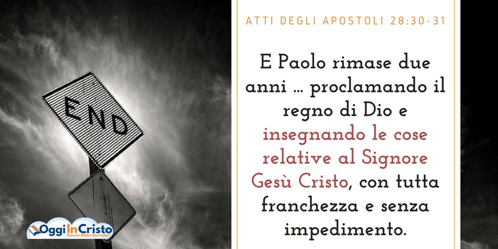 Il libro ci ha mostrato che i discepoli di Gesù sono stati perseguitati fin dal principio ma questo non ha impedito che il messaggio si espandesse sempre di più. Anche il viaggio di Paolo verso Roma era stato pieno di pericoli ma alla fine Paolo era arrivato e l’autore conclude con una scena che ci trasmette una certa serenità e speranza. Infatti Paolo per due anni interi, nonostante fosse agli arresti domiciliari, poté parlare del regno di Dio e del Re dei Re, il Signore Gesù Cristo, senza alcun impedimento!