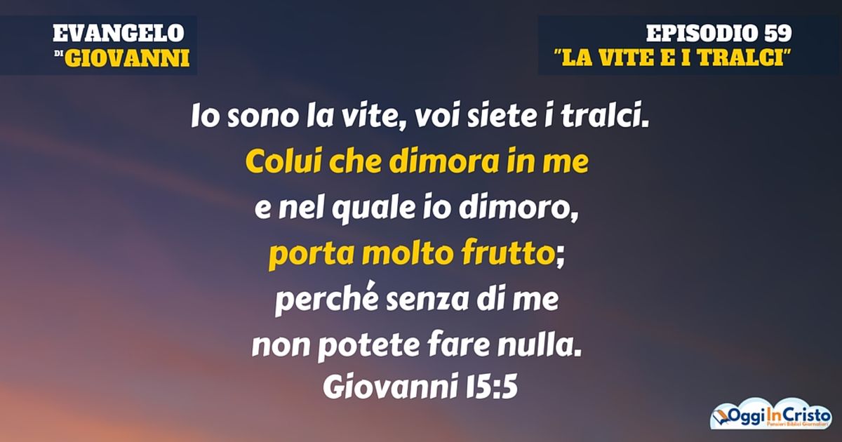 «Io sono la vera vite e il Padre mio è il vignaiuolo. Ogni tralcio che in me non dà frutto, lo toglie via; e ogni tralcio che dà frutto, lo pota affinché ne dia di più. Voi siete già puri a causa della parola che vi ho annunciata. Dimorate in me, e io dimorerò in voi. Come il tralcio non può da sé dare frutto se non rimane nella vite, così neppure voi, se non dimorate in me. Io sono la vite, voi siete i tralci. Colui che dimora in me e nel quale io dimoro, porta molto frutto; perché senza di me non potete fare nulla. Se uno non dimora in me, è gettato via come il tralcio, e si secca; questi tralci si raccolgono, si gettano nel fuoco e si bruciano. Se dimorate in me e le mie parole dimorano in voi, domandate quello che volete e vi sarà fatto. In questo è glorificato il Padre mio: che portiate molto frutto, così sarete miei discepoli.