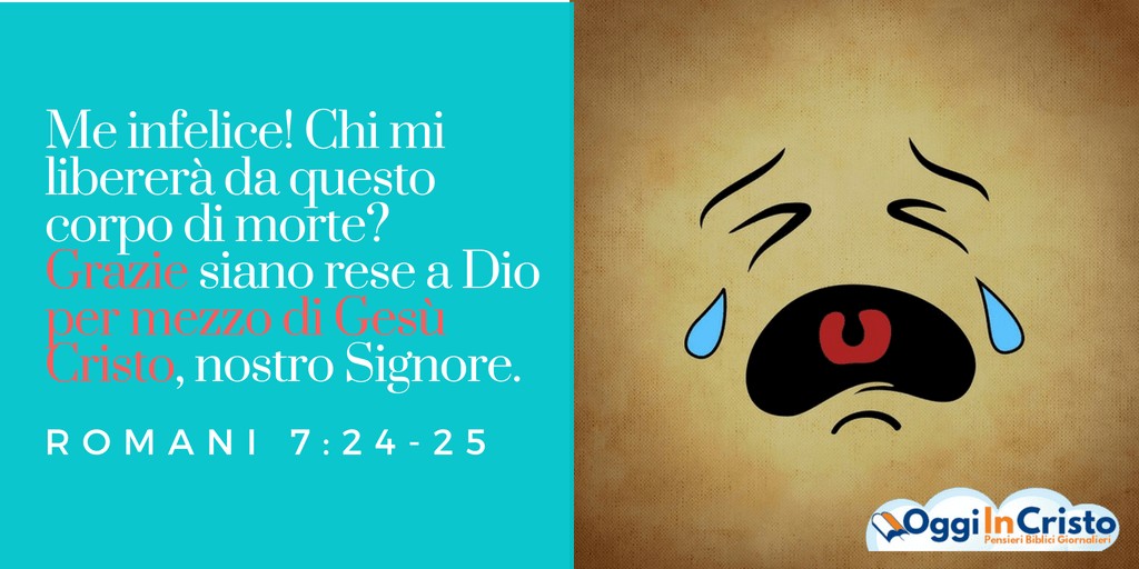 Se anche tu, come me, nella tua vita hai cercato di ubbidire a Dio basandoti sulle tue forze, hai sicuramente sperimentato la frustrazione che Paolo ha descritto in questo brano e ti sei ritrovato a gridare:” Me infelice! Chi mi libererà?”.  Ma spero che anche tu, come me, hai compreso che non hai nessuna possibilità di farcela da solo, hai bisogno di nascere di nuovo, hai bisogno di essere trasformato dallo Spirito Santo e hai bisogno di affidarti a Lui affinché ti guidi ogni giorno nel combattere questa lotta. Solo così potrai realizzare la vittoria sul peccato che Dio vuole darti.