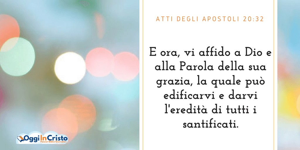 E ora, vi affido a Dio e alla Parola della sua grazia, la quale può edificarvi e darvi l’eredità di tutti i santificati. Non ho desiderato né l’argento, né l’oro, né i vestiti di nessuno. Voi stessi sapete che queste mani hanno provveduto ai bisogni miei e di coloro che erano con me. In ogni cosa vi ho mostrato che bisogna venire in aiuto ai deboli lavorando così, e ricordarsi delle parole del Signore Gesù, il quale disse egli stesso: “Vi è più gioia nel dare che nel ricevere”».