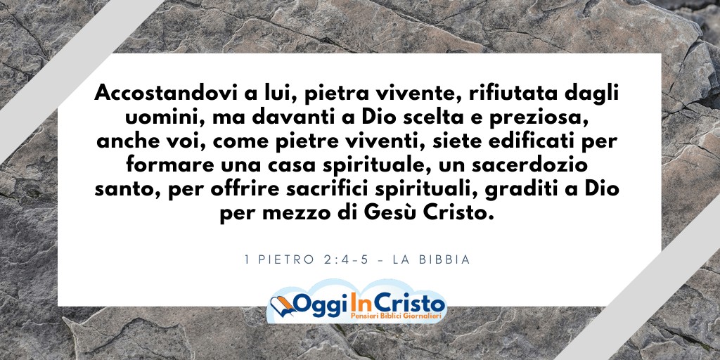 Sbarazzandovi di ogni cattiveria, di ogni frode, dell’ipocrisia, delle invidie e di ogni maldicenza,  come bambini appena nati, desiderate il puro latte spirituale, perché con esso cresciate per la salvezza, se davvero avete gustato che il Signore è buono.  Accostandovi a lui, pietra vivente, rifiutata dagli uomini, ma davanti a Dio scelta e preziosa, anche voi, come pietre viventi, siete edificati per formare una casa spirituale, un sacerdozio santo, per offrire sacrifici spirituali, graditi a Dio per mezzo di Gesù Cristo. Infatti si legge nella Scrittura: