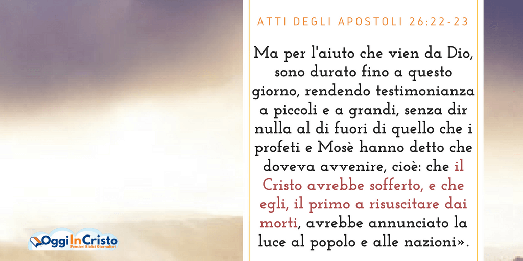 Perciò, o re Agrippa, io non sono stato disubbidiente alla visione celeste; ma, prima a quelli di Damasco, poi a Gerusalemme e per tutto il paese della Giudea e fra le nazioni, ho predicato che si ravvedano e si convertano a Dio, facendo opere degne del ravvedimento. Per questo i Giudei, dopo avermi preso nel tempio, tentavano di uccidermi. Ma per l’aiuto che vien da Dio, sono durato fino a questo giorno, rendendo testimonianza a piccoli e a grandi, senza dir nulla al di fuori di quello che i profeti e Mosè hanno detto che doveva avvenire, cioè: che il Cristo avrebbe sofferto, e che egli, il primo a risuscitare dai morti, avrebbe annunciato la luce al popolo e alle nazioni».
