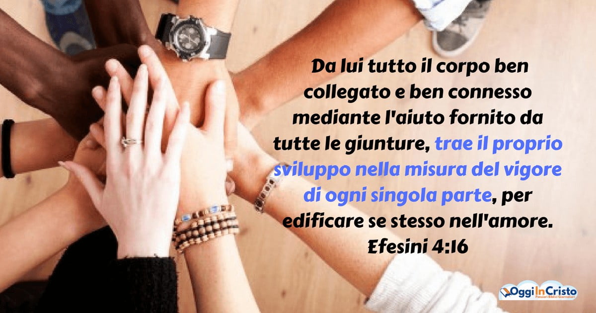 È lui che ha dato alcuni come apostoli, altri come profeti, altri come evangelisti, altri come pastori e dottori, per il perfezionamento dei santi in vista dell’opera del ministero e dell’edificazione del corpo di Cristo, fino a che tutti giungiamo all’unità della fede e della piena conoscenza del Figlio di Dio, allo stato di uomini fatti, all’altezza della statura perfetta di Cristo; affinché non siamo più come bambini sballottati e portati qua e là da ogni vento di dottrina per la frode degli uomini, per l’astuzia loro nelle arti seduttrici dell’errore; ma, seguendo la verità nell’amore, cresciamo in ogni cosa verso colui che è il capo, cioè Cristo. Da lui tutto il corpo ben collegato e ben connesso mediante l’aiuto fornito da tutte le giunture, trae il proprio sviluppo nella misura del vigore di ogni singola parte, per edificare se stesso nell’amore.