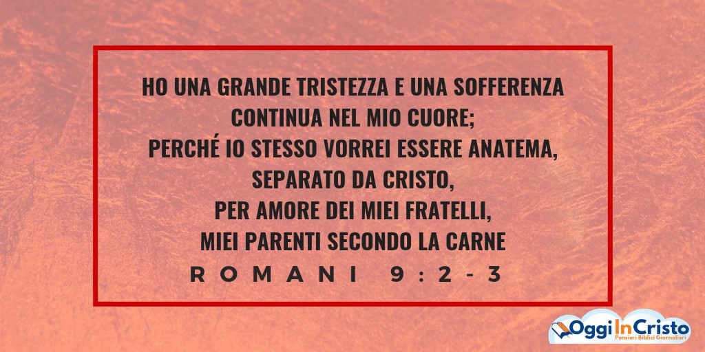 Dico la verità in Cristo, non mento – poiché la mia coscienza me lo conferma per mezzo dello Spirito Santo – ho una grande tristezza e una sofferenza continua nel mio cuore; perché io stesso vorrei essere anatema, separato da Cristo, per amore dei miei fratelli, miei parenti secondo la carne, cioè gli Israeliti, ai quali appartengono l’adozione, la gloria, i patti, la legislazione, il servizio sacro e le promesse; ai quali appartengono i padri e dai quali proviene, secondo la carne, il Cristo, che è sopra tutte le cose Dio benedetto in eterno. Amen!