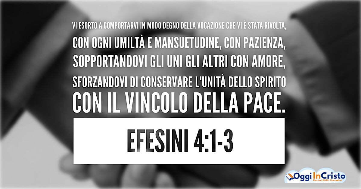 Io dunque, il prigioniero del Signore, vi esorto a comportarvi in modo degno della vocazione che vi è stata rivolta, con ogni umiltà e mansuetudine, con pazienza, sopportandovi gli uni gli altri con amore, sforzandovi di conservare l’unità dello Spirito con il vincolo della pace. Vi è un corpo solo e un solo Spirito, come pure siete stati chiamati a una sola speranza, quella della vostra vocazione. V’è un solo Signore, una sola fede, un solo battesimo, un solo Dio e Padre di tutti, che è al di sopra di tutti, fra tutti e in tutti.